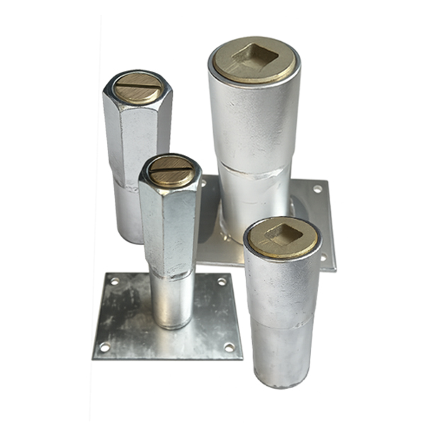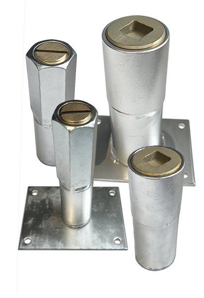 Internally threaded, stainless steel concrete inserts with brass plug for either 1-5/8” or 13/16” flex pegs.